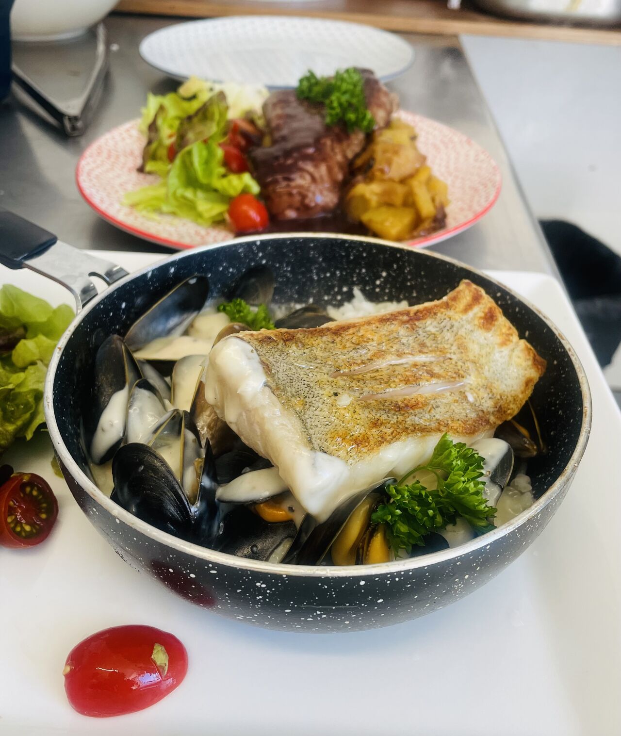 accompagné de frites et d'une savoureuse sauce 'marchand de vin' 15,90€.